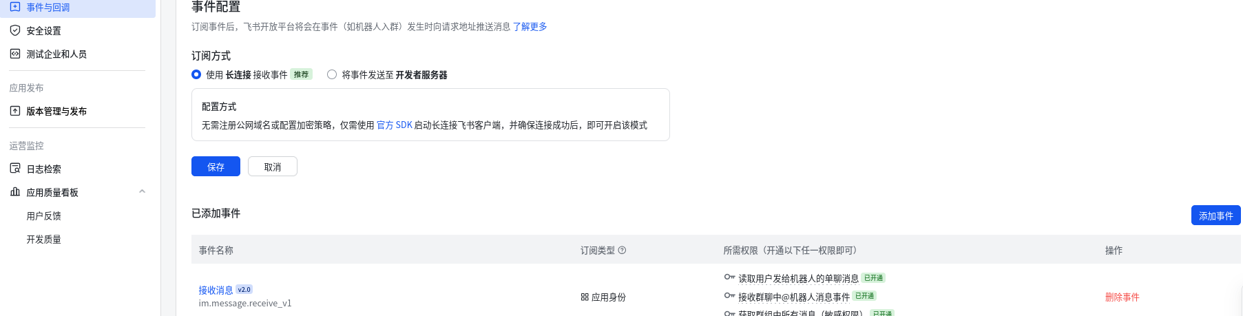 飞书事件与回调中,订阅方式选择使用长链接,添加事件:接收消息,创建新版本。
