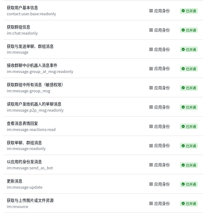 打开飞书开放平台 https://open.feishu.cn/app,创建企业自建应用,添加应用能力(机器人),添加权限如下图,版本管理与发布创建版本。
