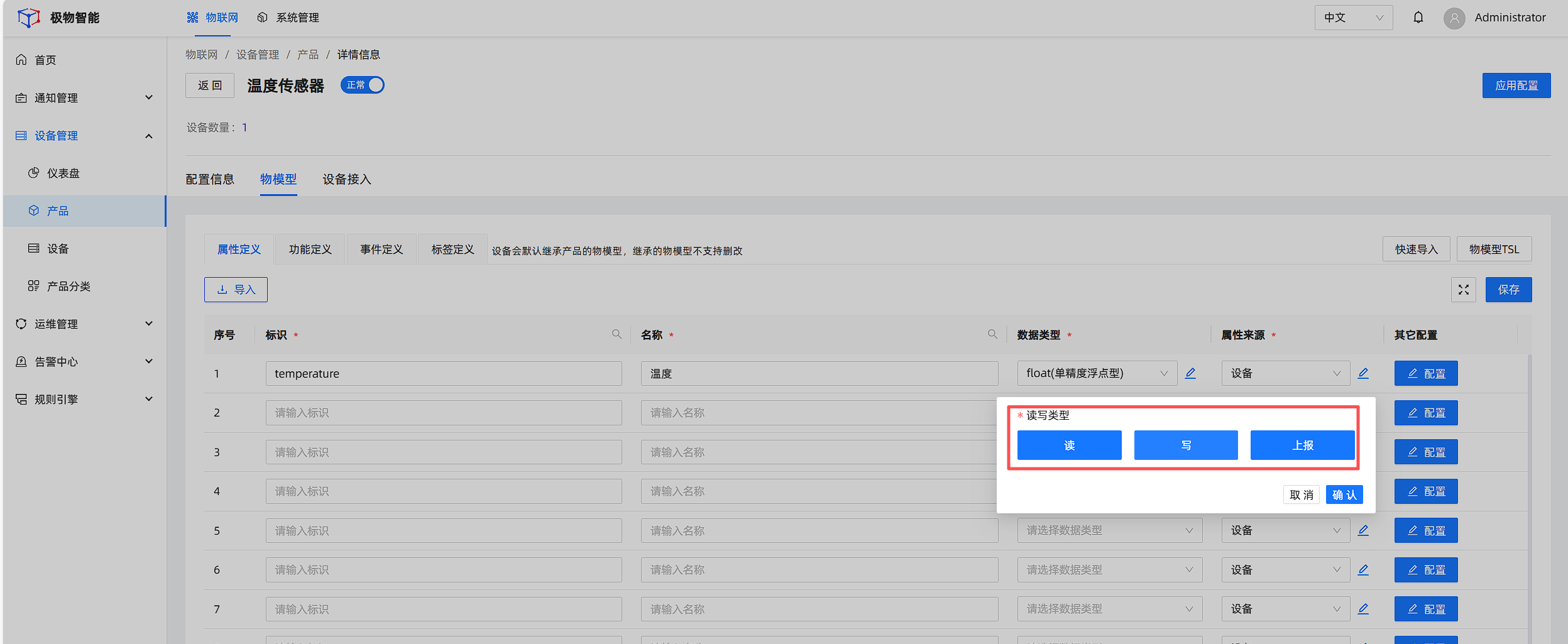 主要是配置产品的物模型