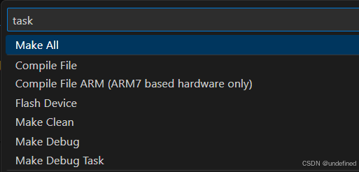 在VS Code中,直接运行「Make All」任务,即可调用预写的Makefile完成编译,输出可直接刷写的 .bin 文件。