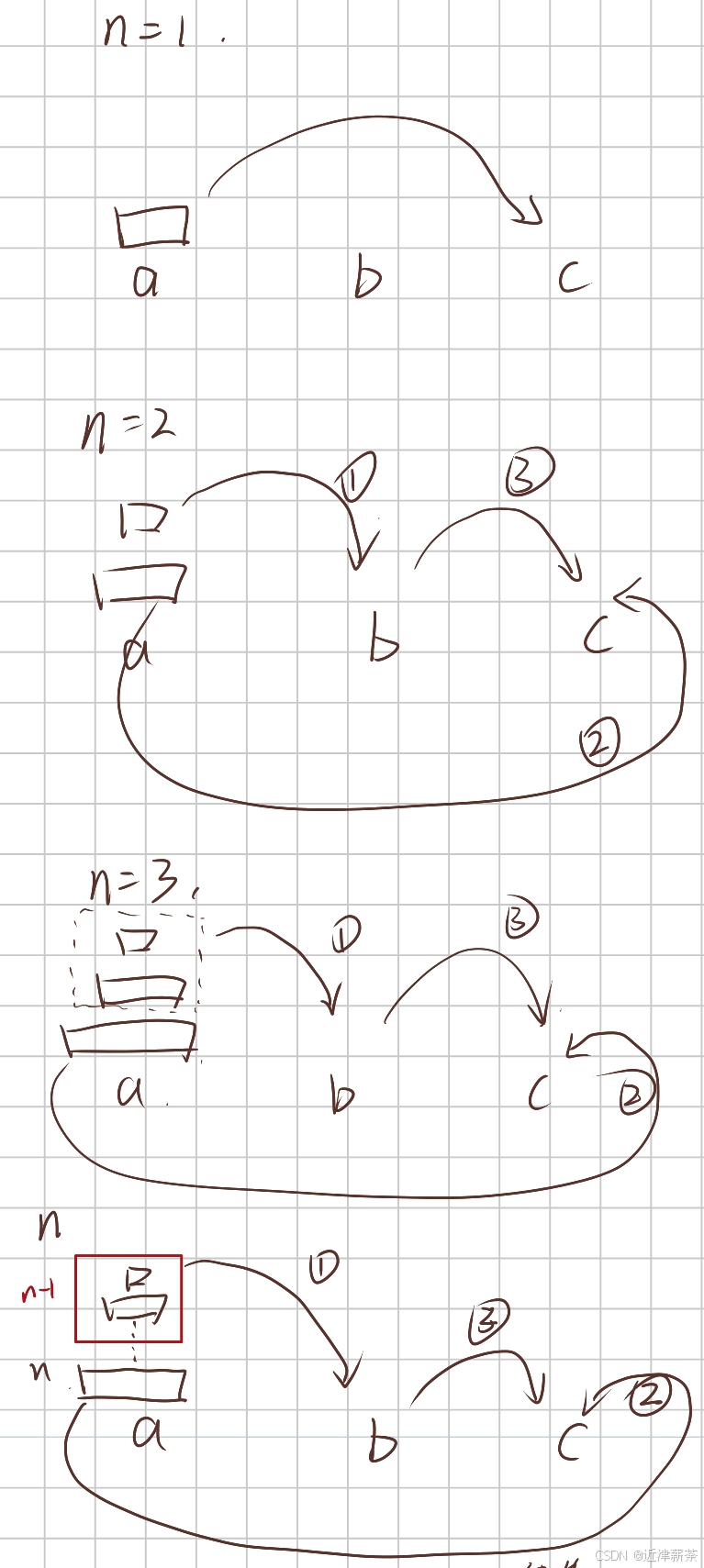 其中第二步很好理解,n=1的时候,只需要第二步即可,无需借空柱(最底层的操作)