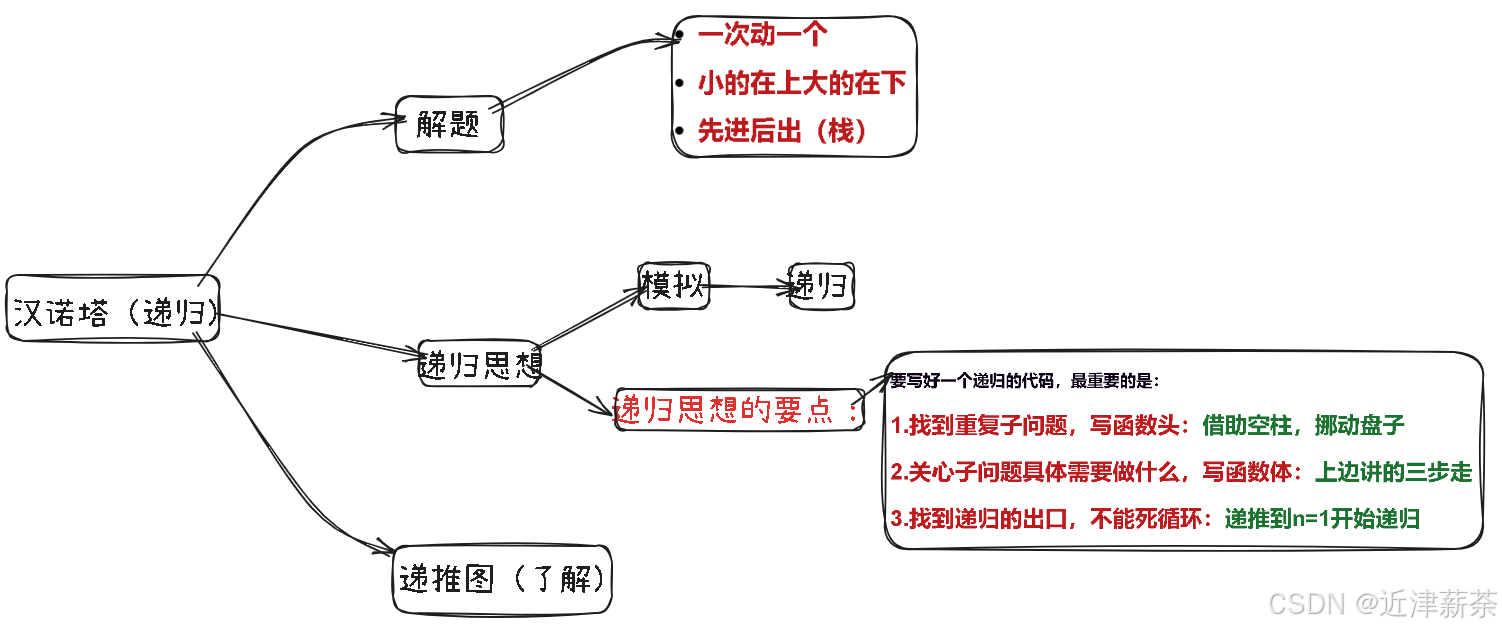 递归,把上边三个基本问题解决好,就没问题了,把一个个子问题当成" 黑盒 ",就像函数中的对应法则f一样,虽然这么说有点神秘,但是你要相信照这样写出来的递归能帮你解决问题,具体怎么解决的,别管,为什么答案是对的,因为我们的逻辑是对滴!