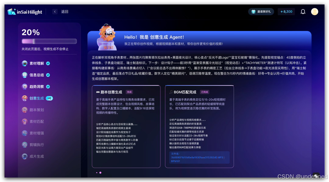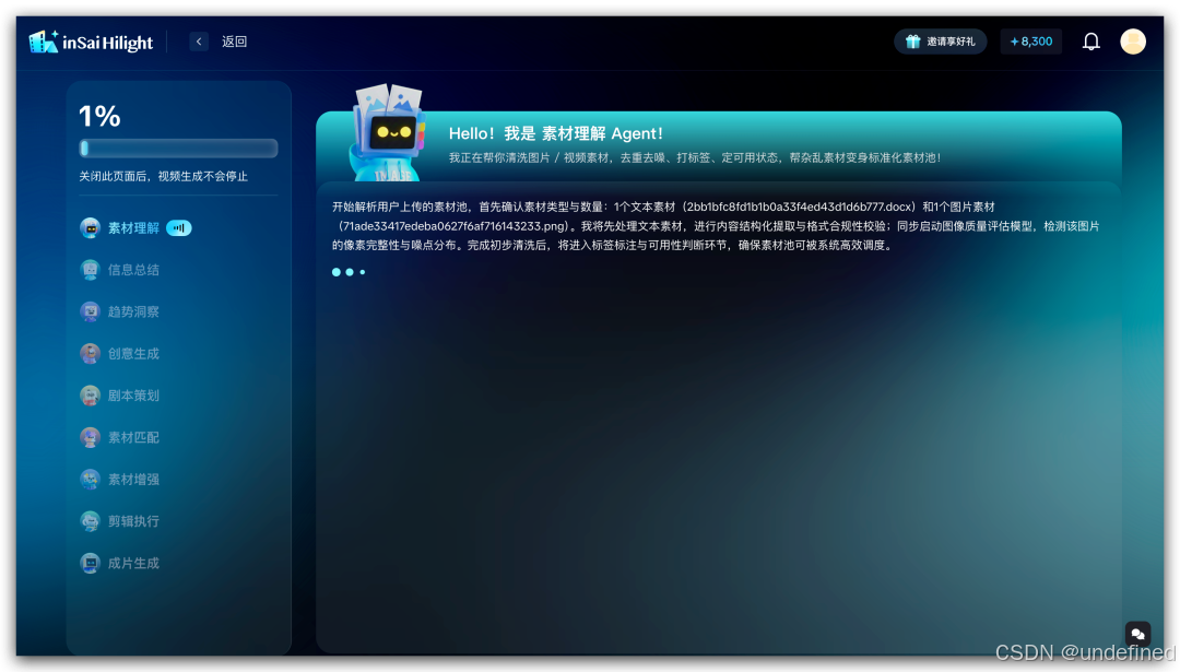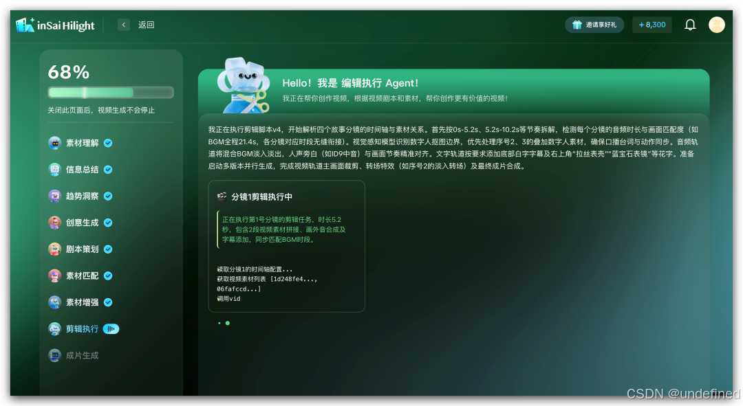 1、每个Agent有独立"判断能力",能够基于上下文和目标实现有效决策,比如洞察 Agent 可否决不合理的创意方向,素材 Agent 能要求重新匹配低质镜头,剪辑 Agent 可动态调整节奏,确保每一步都服务于最终成片质量。