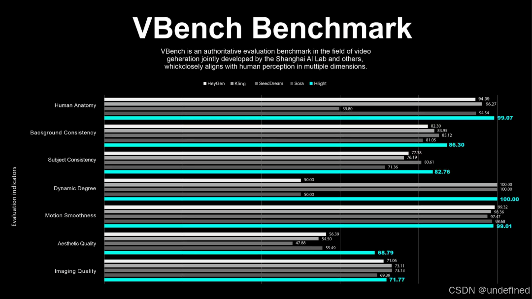 首先,我看到在权威视频生成模型综合评测基准VBench测评结果中,Hlight展现了非常出色的能力,在背景一致性、主体一致性和美学质量等核心指标位居行业前列这些核心指标上面稳居第一,在成像质量这个板块也是名列前茅,超越了国外的顶级模型Sora,这也为Hlight的呈现效果打下了坚实的基础。