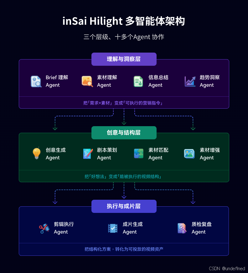「理解与洞察层」:包含brief理解、素材理解信息总结和趋势洞察agent,能更好的把需求和素材转化为可执行的营销命令;