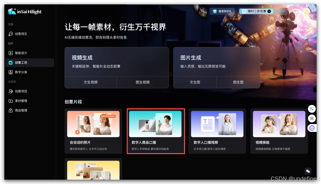 此外,我还体验了一下inSai Hilight的创意工坊页面的数字人商品口播功能,有不错的表现
