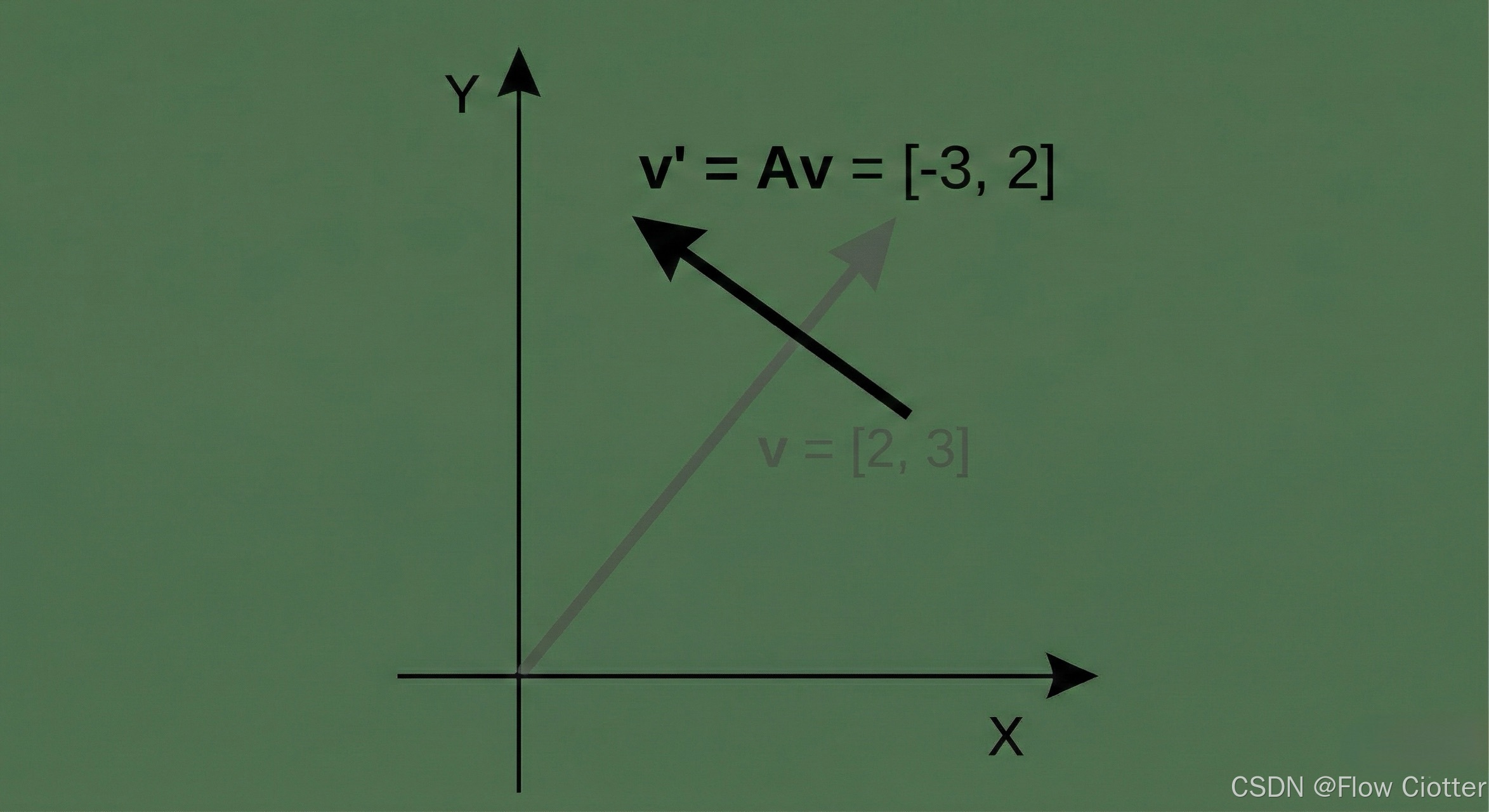 在下图中,我们可以看到原始的灰色向量 = [2, 3]经过矩阵 A 的变换后,变成了新的黑色向量 v' = [-3, 2]。可以看到,新的向量正是原向量逆时针旋转 90 度的结果。