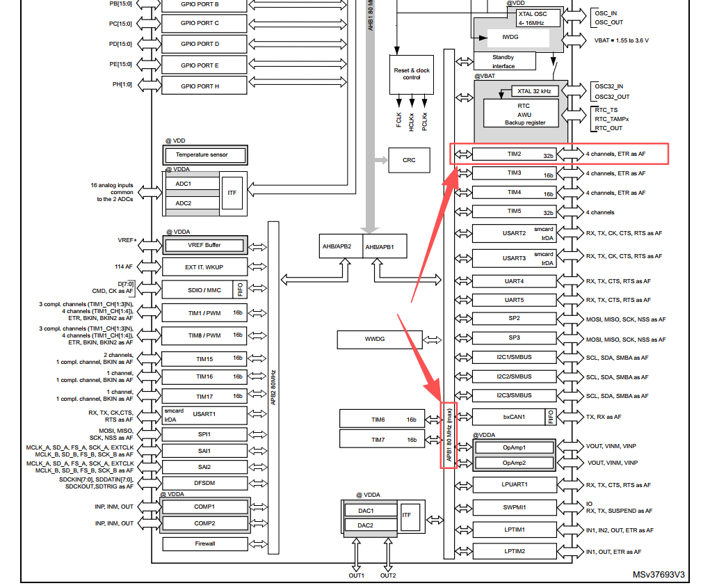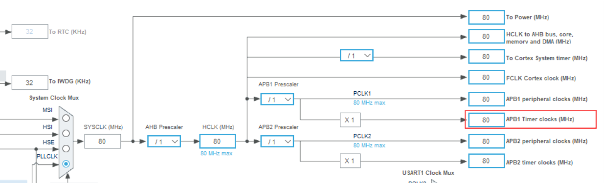 通过这里可以看到, TIM2定时器挂在APB1总线上, 而我们通过时钟树可知, APB1总线时钟为80MHz.