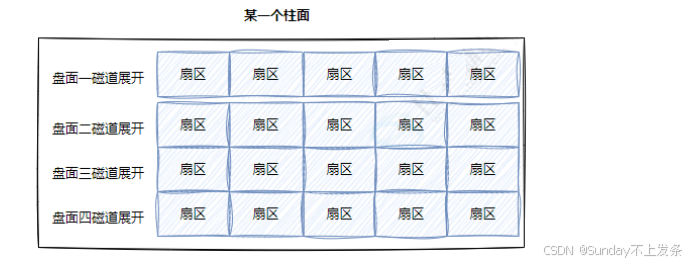 **• 柱面:**整个磁盘所有盘面的同一个磁道,即柱面展开:
