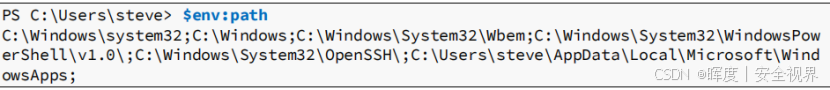 上图显示,连续的函数调用按照"DLL搜索顺序 "进行,从应用程序所在的目录开始,以PATH环境变量中的目录结束。我们可通过在PowerShell中显示此环境变量的内容来确认这一点,使用**$env:path**命令。