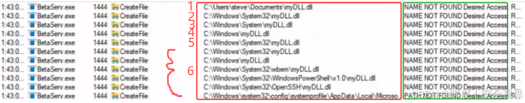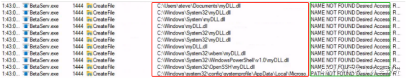 CreateFile函数用于创建或打开文件。注意到,CreateFile调用试图在几个路径中打开名为myDLL.dll 的文件。详细列中显示这些调用的状态为NAME NOT FOUND。