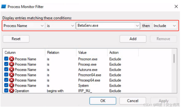 我们的目标是:Process Monitor只显示与BetaServ进程相关的事件。过滤器由四个条件组成。按照下图红框进行配置,输入后将点击添加: