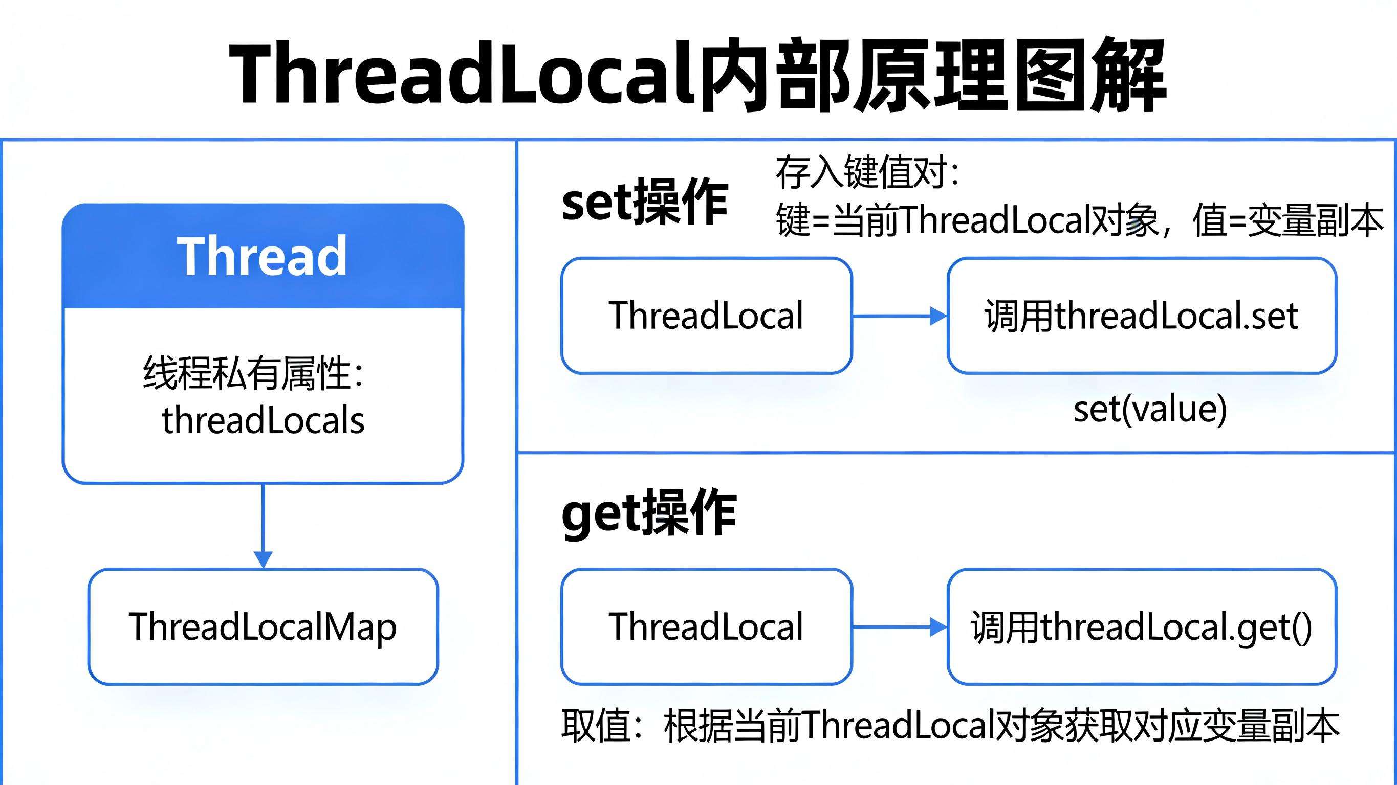 原理解析: ThreadLocal 内部维护了一个 ThreadLocalMap,这个 Map 是线程(Thread)的私有属性(threadLocals),而非 ThreadLocal 自身的属性。当我们调用 threadLocal.set(value) 时,是向当前线程(Thread.currentThread())的 ThreadLocalMap 中存入键值对(键为当前 ThreadLocal 对象,值为变量副本);调用 threadLocal.get() 时,也是从当前线程的 ThreadLocalMap 中根据当前 ThreadLocal 对象取对应的值。