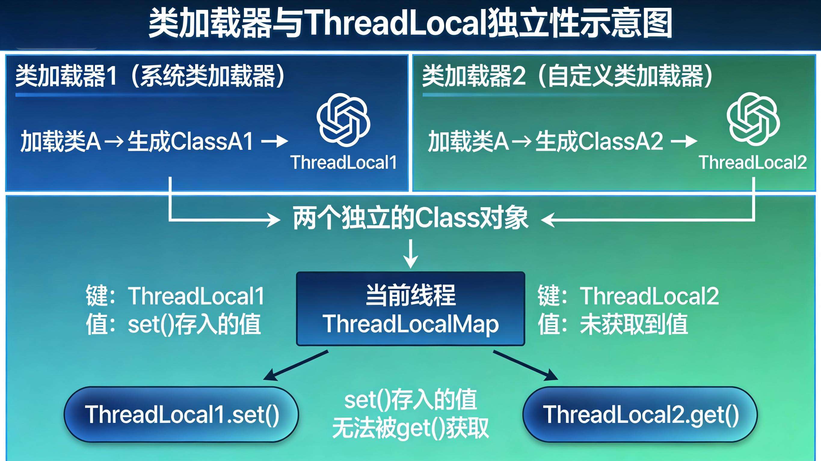 这种原因相对隐蔽,很多开发者会忽略类加载器的影响,其本质是:不同类加载器加载同一个类(全限定名相同),会生成两个不同的 Class 对象;而 ThreadLocal 作为变量的载体,若其所在的类被不同类加载器加载,会产生多个 ThreadLocal 实例,导致 set 和 get 操作的不是同一个 ThreadLocal 对象,最终取不到值。