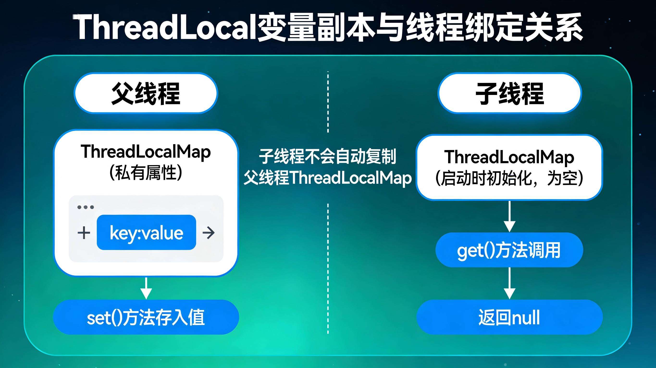 原理解析: ThreadLocal 的变量副本是绑定到具体线程的,父线程的 ThreadLocalMap 是父线程的私有属性,子线程启动时,会初始化自己的 ThreadLocalMap(为空),不会自动复制父线程 ThreadLocalMap 中的键值对。因此,即使父线程已经存入值,子线程调用 get() 时,自己的 ThreadLocalMap 中没有对应的数据,就会返回 null。