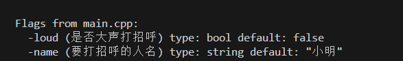 DEFINE_string(name, "小明", "要打招呼的人名"); // 名字,默认是"小明"