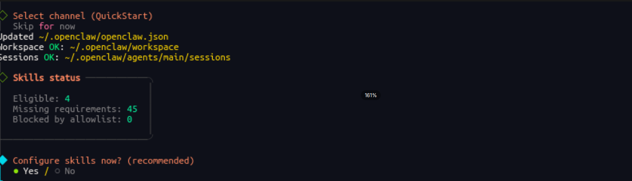 推荐选择默认 yes,可启用已符合条件的 4 个技能,快速体验扩展功能;后续可通过补充依赖(安装对应软件、配置权限)解锁更多技能。若暂时无需扩展功能,选择 No 跳过此步骤。