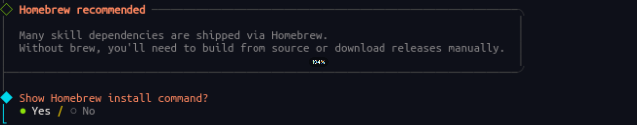 推荐选择默认yes,系统会提供 Homebrew 的安装命令,安装后可快速自动部署技能所需依赖。