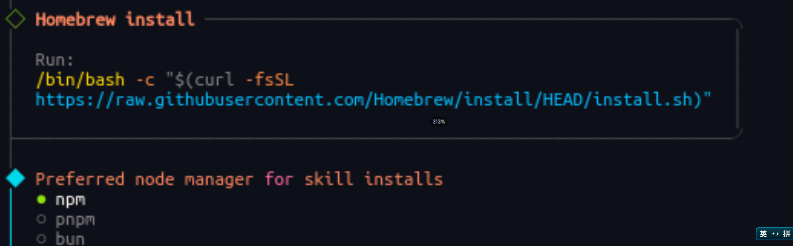 选择后进入 Homebrew 安装及技能包管理器选择界面,推荐使用默认 npm: