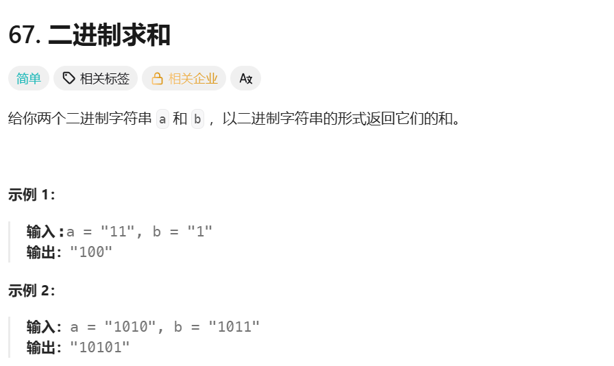 **思路:**定义两个指针分别指向两字符串末尾,定义一个变量存储进位,模拟加法的过程,只要两个字符串还有一个没有遍历完或者进位不为 0,循环就不能停止,因为还有数据需要往结果字符串中添加。需要注意的是,下面代码循环结束后得到的结果字符串不是最终结果,它其实是最终结果反过来了。