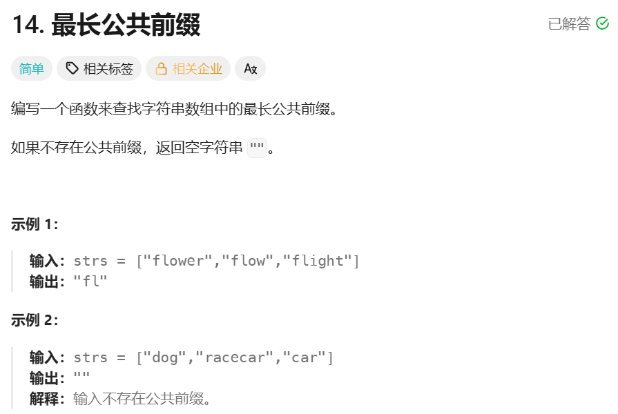 **思路:**将所有字符串两两比较即可,先比较第一个和第二个,然后再将得到的公共前缀和第三个字符串进行比较,然后继续得到公共前缀,继续和下一个字符串进行比较。