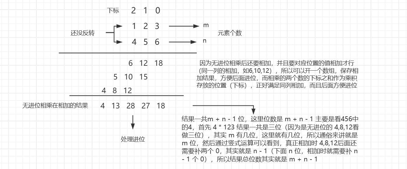 **思路:**无进位相乘在相加,最后处理进位。将无进位相乘在相加的结果先存放在一个数组中,方便后面处理进位,将两个字符串反转,每次相乘的两个数的下标加和就是乘积应该存放的位置,处理进位的方式和字符串相加处理进位的方式相同,定义一个变量存放进位,然后遍历数组,将当前遍历的数加到进位中,取模 10 就是要加到结果字符串中的值,除以 10 就是下一轮循环的进位,进位一开始赋值 0。
