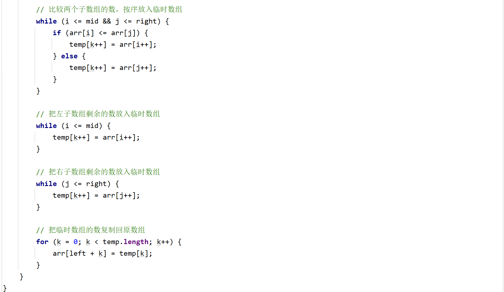 - 治 :把两个有序的子数组合并成一个更大的有序数组;
