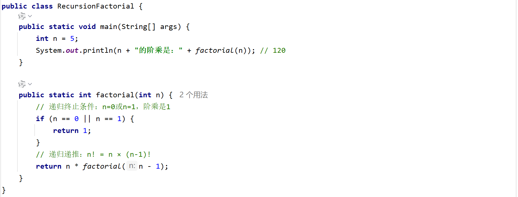 - 递归终止条件 :当小问题简单到可以直接解决时,停止递归(必须有,否则会无限递归导致栈溢出)。