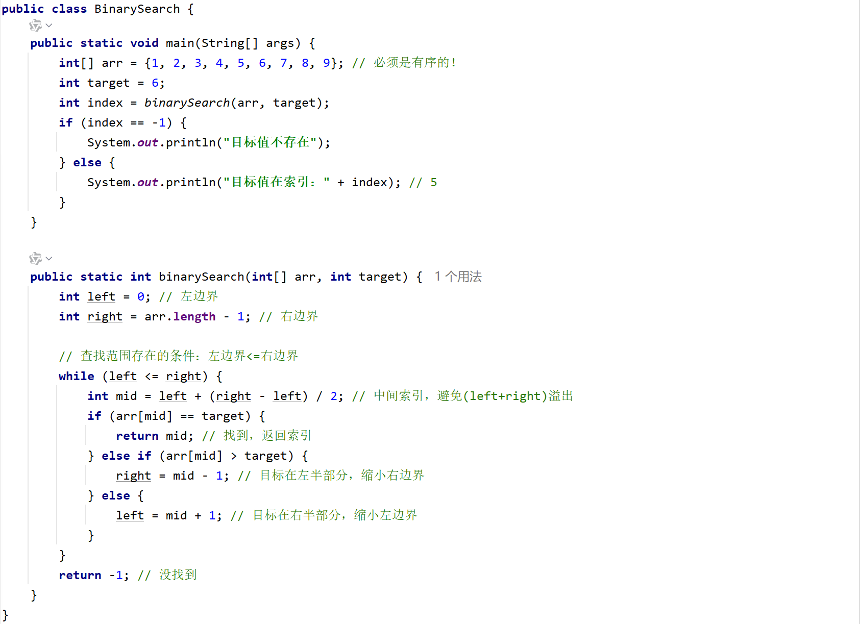 - 核心前提:数据必须有序!无序数组用二分查找必错;
