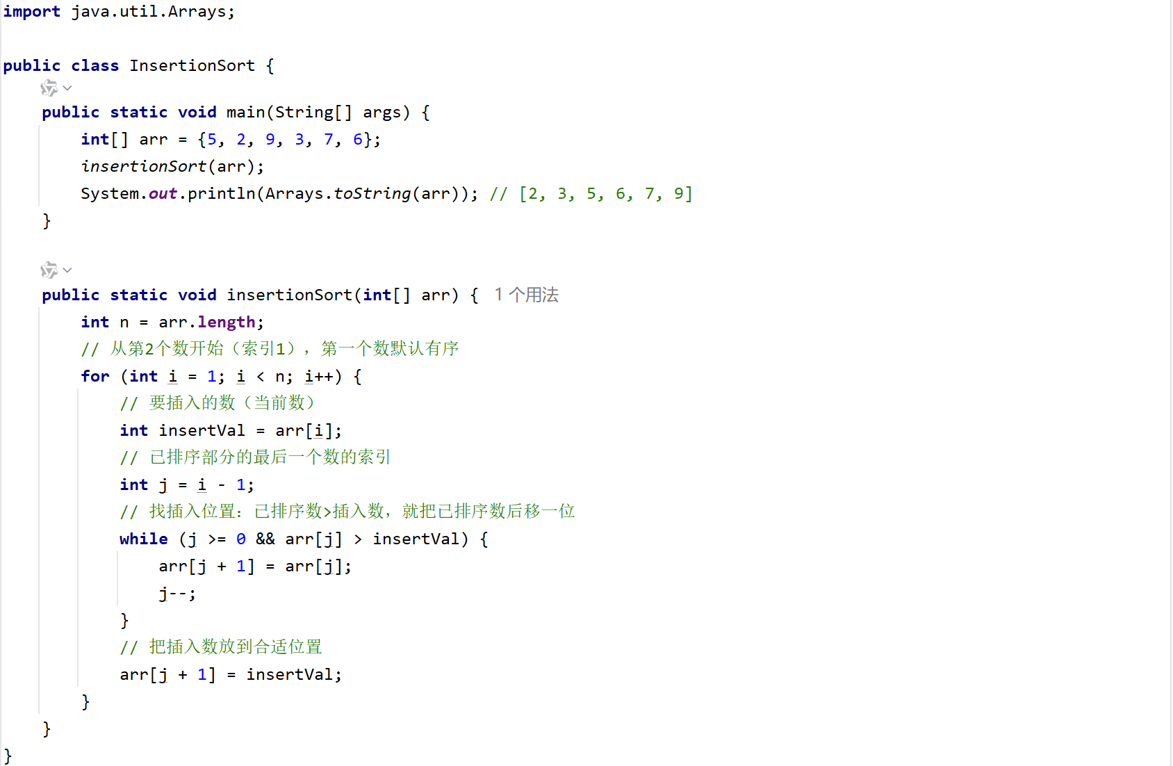 | 插入排序 | O(n²) | 稳定 | 数据量小 / 接近有序 | 逐个插入有序部分 |