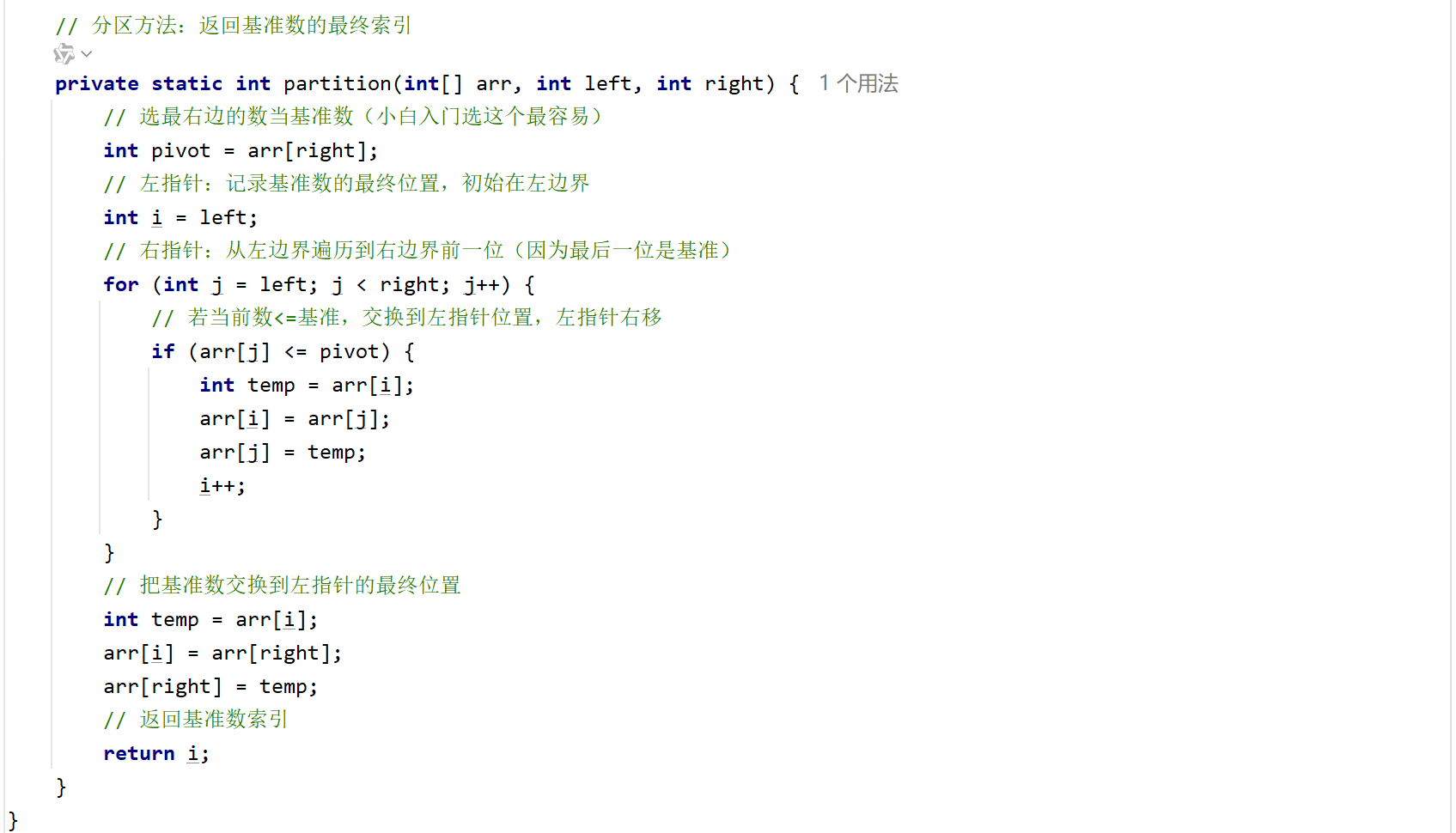 - 平均效率极高(时间复杂度 O (nlogn)),最坏情况(数组已完全有序)是 O (n²),但日常使用几乎遇不到;