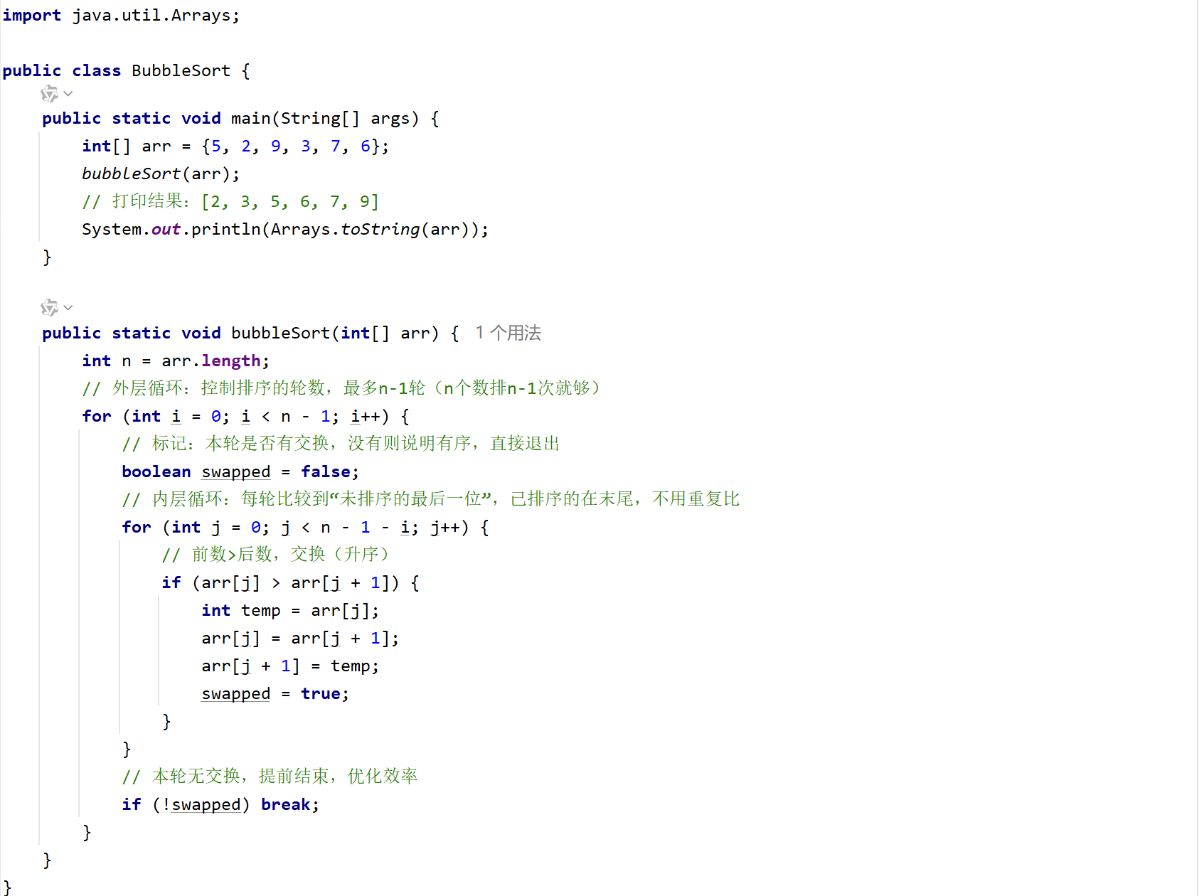 像水里的气泡一样,大的数慢慢 "浮" 到数组末尾。重复遍历数组,每次比较相邻两个数,若顺序错了就交换,直到一轮遍历中没有交换发生(说明已经有序)。