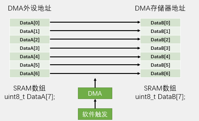 外设的地址DataA[7]的首地址 、存储器的地址DataB[7]的首地址、数据宽度都是8位字节、两边都是地址自增模式、传输方向DataA[7]-->DataB[7]、计数器值为7、不需要自动重装、软件触发。