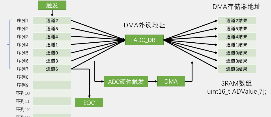 DMA转运的时机,需要和ADC单个通道转换完成同步,所以DMA的触发要选择ADC的硬件触发。