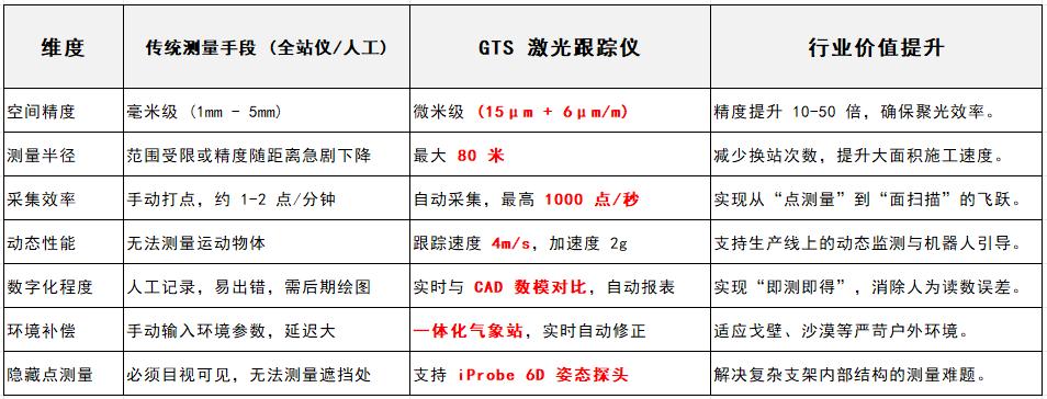 我们将技术指标制成对比表格,直观展示 GTS 激光跟踪仪与传统测量手段的参数差异: