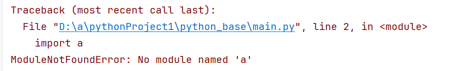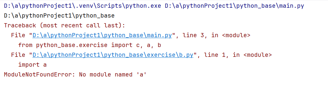 因为此时main所处的目录是python_base,在此时所有import执行的所参照的目录都是python_base,而b模块中是直接引用的a模块,所以main的程序会在python_base下面找a,但在该目录下无法找到a的所以会发生报错