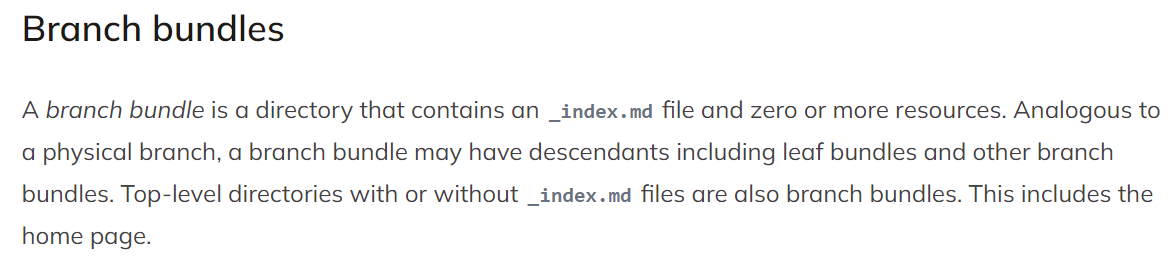OK,介绍完 Leaf Bundle,继续看 Branch Bundle,Branch Bundle 是首页板块配置里的核心概念 ,其官方描述如下 https://gohugo.io/content-management/page-bundles/#branch-bundles
