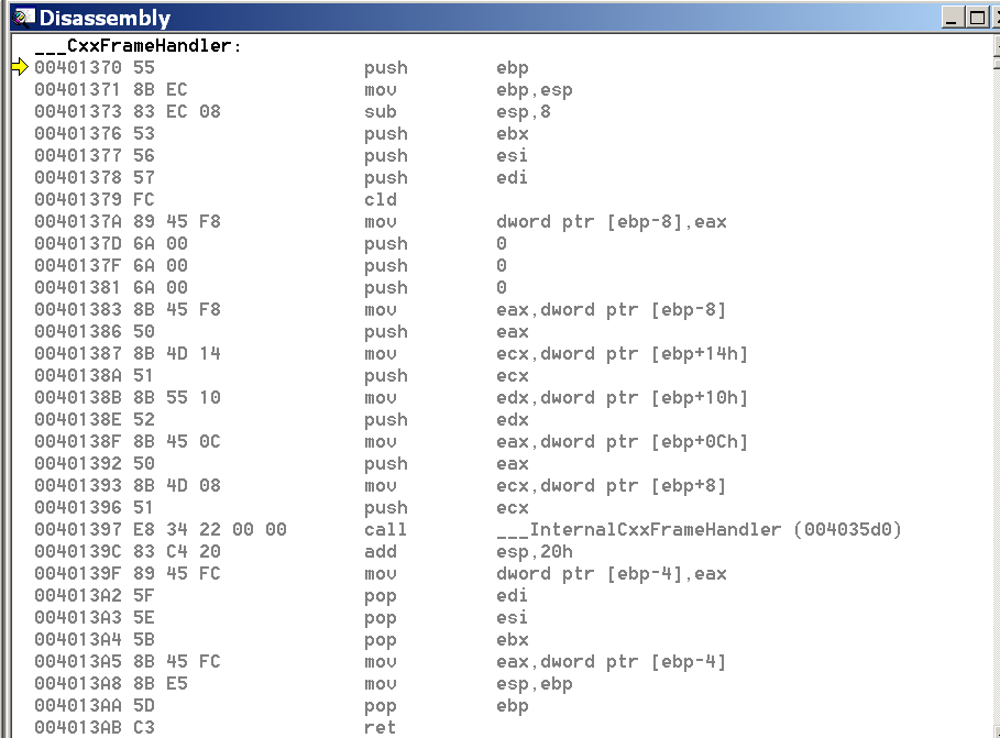 其中eax是___CxxFrameHandler函数的参数,是FuncInfo的地址。该函数是对异常信息进行获取的,我们进一步查看该函数的代码: