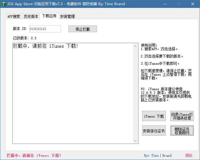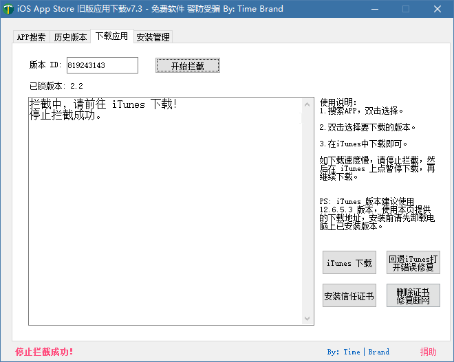 在【历史版本】中找到想要下载的版本,并双击,会切换到【下载应用】中,并显示 【拦截中,请前往 iTunes 下载!】 的消息