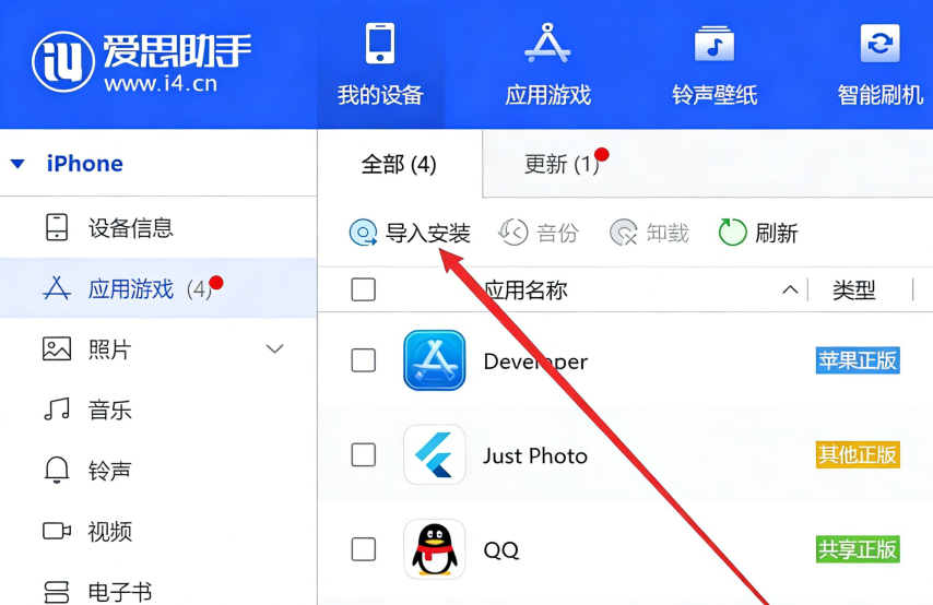 在确保手机和电脑连接完成后,打开爱思助手,在左侧切换到 【应用】,点击 【导入安装】,然后选择在 iTunes 下载的 ipa 文件,然后等待安装成功就 OK。