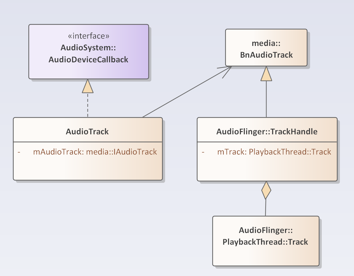 Track: 对应 AudioTrack,存在于 PlaybackThread 中。它管理着共享内存(SharedBuffer),Client 端往里写数据,Thread 从里读数据。