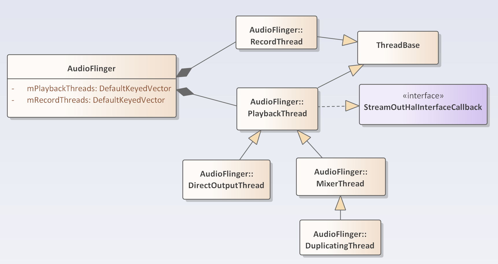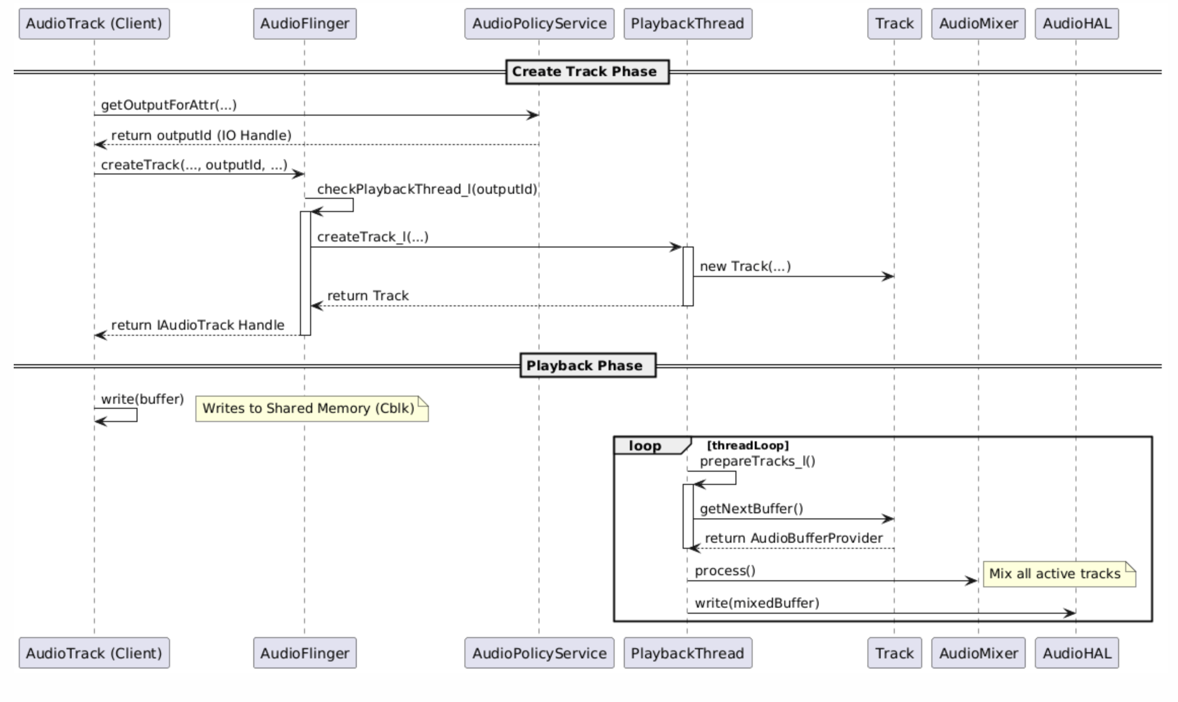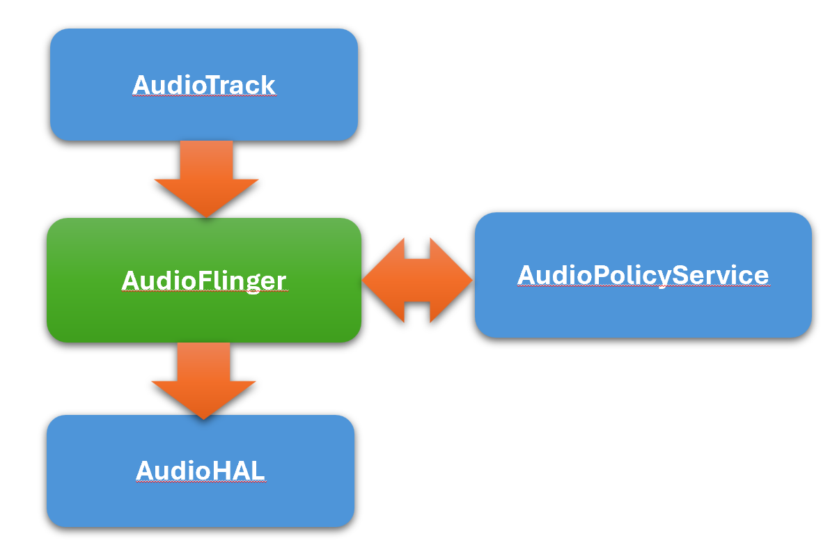 - Threads: 管理不同输出/输入流的线程 (PlayBackThread, RecordThread)。