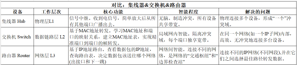 - 为什么有路由器?交换机只能在一个广播域内工作,所有连接在交换机上的设备,必须属于同一个IP子网,无法理解IP网段的结构。路由器是不同广播域/不同IP网络之间的桥梁。分隔广播域,连接不同的子网(如 192.168.1.0/24 10.1.1.0/24),甚至连接家庭网络和整个互联网。
