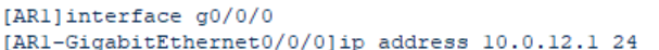 255.255.255.255/32 :广播地址,掩码32位,只有这一个地址。 127.0.0.0 -127.255.255.255: 回环网段。不能配置主机的网卡上,测试TCP/IP协议栈是否正常。在华为设备中NetHop-127.0.0.1:需要把数据解封装,把数据交给主机内部CPU处理,交给本设备处理。出接口Interface-InLookBack0:内置接口,交给本设备处理。 - 给AR1的接口g0配IP: