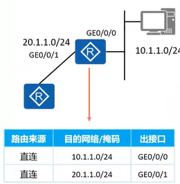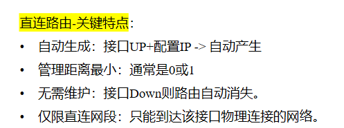- 直连路由Directly Connected Route:由设备自动生成指向本地直连网络。路由器自动发现并添加到路由表中的路由条目,无需任何配置。在一台设备的某个接口配了一个IP地址并物理和协议状态均为UP,就会生成一些路由信息(路由条目)。我家的Wi-Fi网络就是我的"直连路由",我的手机 连接到自家路由器后,自动就知道如何与家里的其他设备(电脑、电视)通信,不需要任何额外设置。但是,无法直接知道如何联系到隔壁邻居家的设备------需要静态或动态路由**。**接口故障即失效。