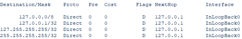 Distination:6 - 6个目的地址(6个目的网段);Routes:6 - 6条路由条目。 proto:路由条目的生产方式。staic-静态;direct-直连。配的IP地址是100.0.0.1/32. pre: 路由优先级,做选举,每种路由方式的优先级是设定好的。优先级越小越优先。