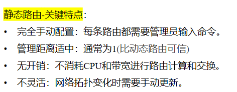 - 静态路由:由网络管理员手工配置的路由条目。什么时候用---网络规模小、网络拓扑稳定、安全要求高(不希望路由信息被动态学习)、作为备份路由、默认路由(指向互联网出口) 。类似手机里保存的固定联系人,对方换了号码,打不通-拓扑变化,会失效 。