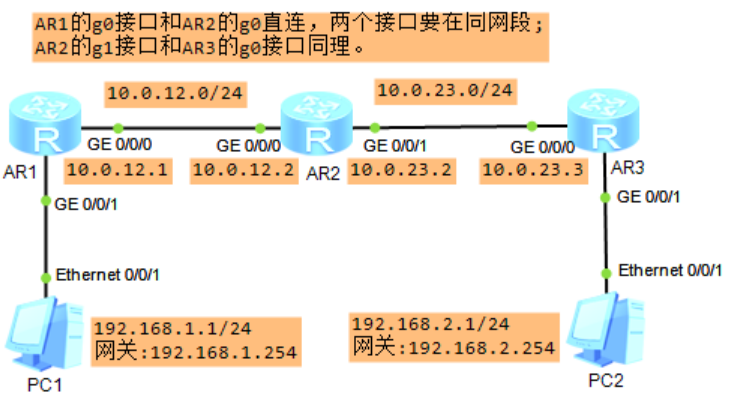 举例:PC1访问PC2,两个PC属于不同网段。直连路由配置