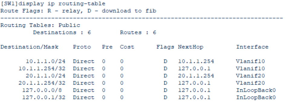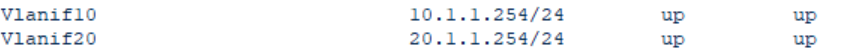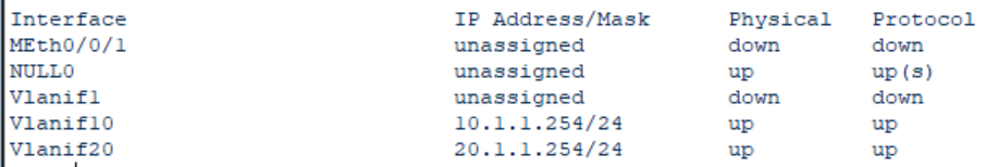 - 如果不划分,创建的虚拟接口状态是-down,不能使用,查看交换机的VLAN信息display vlan,没有任何接口属于vlan10或20