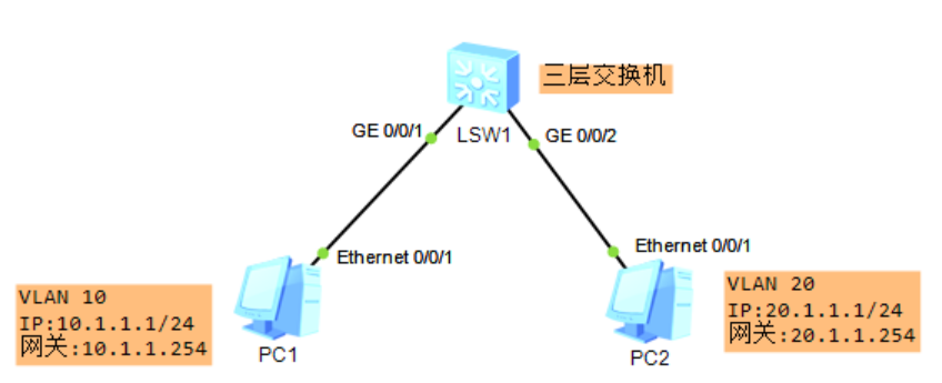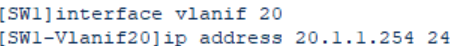 - 要给交换机的某个VLAN中的物理接口创建虚拟接口---VLANIF接口(vlan interface),然后在配置网关IP,需满足两个条件:(1)和pc在同一个网段;(2)和PC在同一广播域。